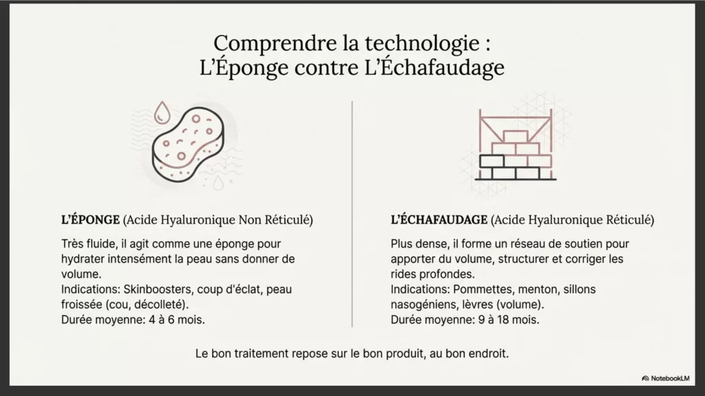 • Résorbable : disparaît progressivement (6 à 18 mois selon le produit et la zone)
