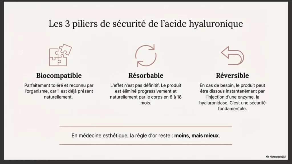 L’acide hyaluronique est un produit biocompatible, biodégradable et réversible. Lorsqu’il est injecté dans un cadre médical strict, il s’agit d’un traitement sûr. La possibilité de dissoudre le produit en cas de besoin est un élément clé de sécurité.