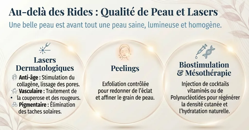 La médecine esthétique moderne repose sur une combinaison raisonnée de techniques permettant d’agir à différents niveaux du vieillissement cutané.