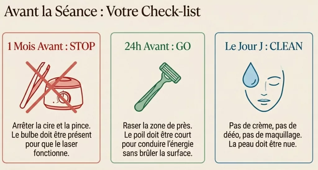 Pour optimiser l’efficacité et la sécurité de l’épilation laser du maillot, quelques règles simples sont à respecter :