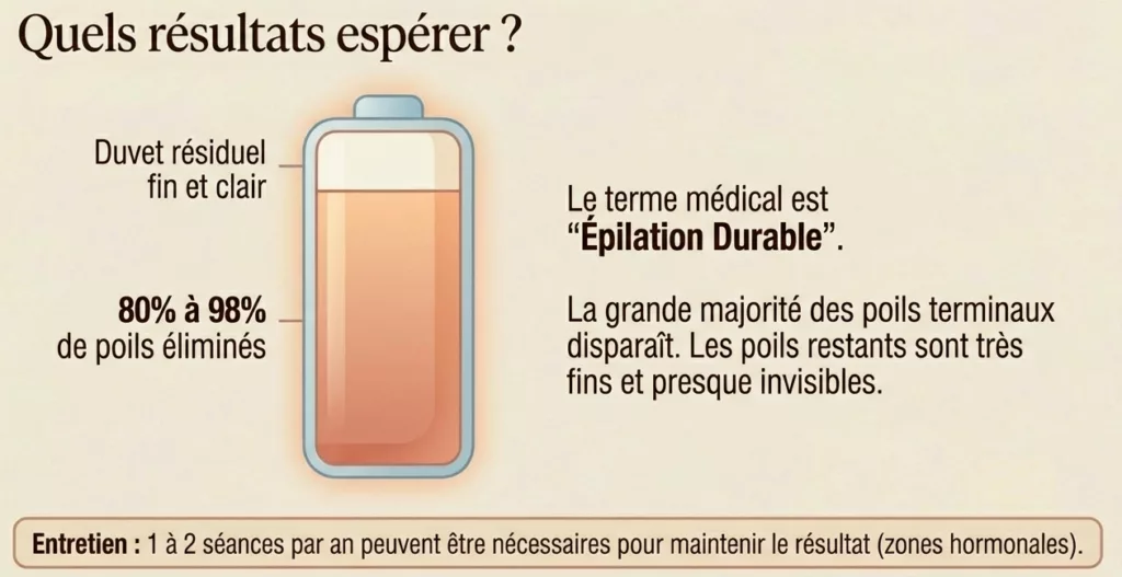 On parle de réduction durable de la pilosité plutôt que d’épilation totalement définitive, car quelques repousses peuvent apparaître au fil des années, nécessitant parfois une séance d’entretien.