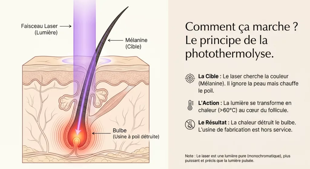 Le laser émet une lumière absorbée par la mélanine contenue dans le poil. Cette énergie est transformée en chaleur et détruit progressivement le bulbe responsable de la repousse.