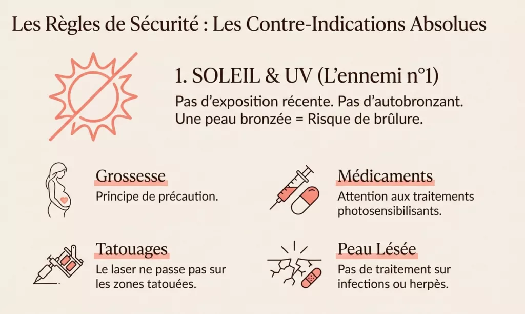 Il est généralement recommandé d’éviter le soleil et les UV pendant plusieurs semaines avant la séance, selon votre phototype et la zone traitée.