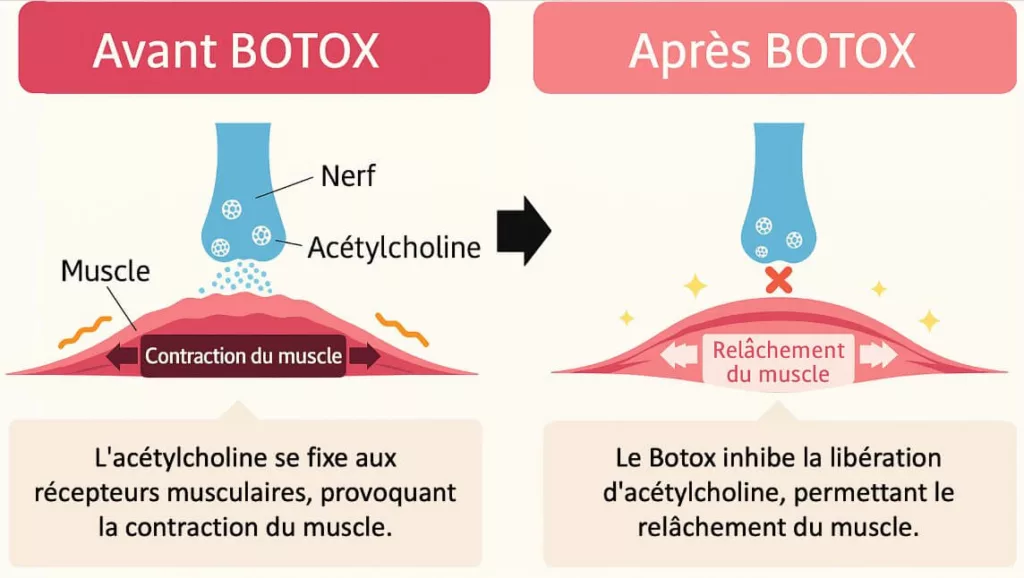 - Injecté en très faible quantité, le Botox empêche la libération de l’acétylcholine.