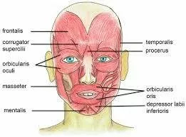 Anatomie musculaire du visage isolant l’ensemble des muscles pouvant être traités par le Botox dans un but esthétique :