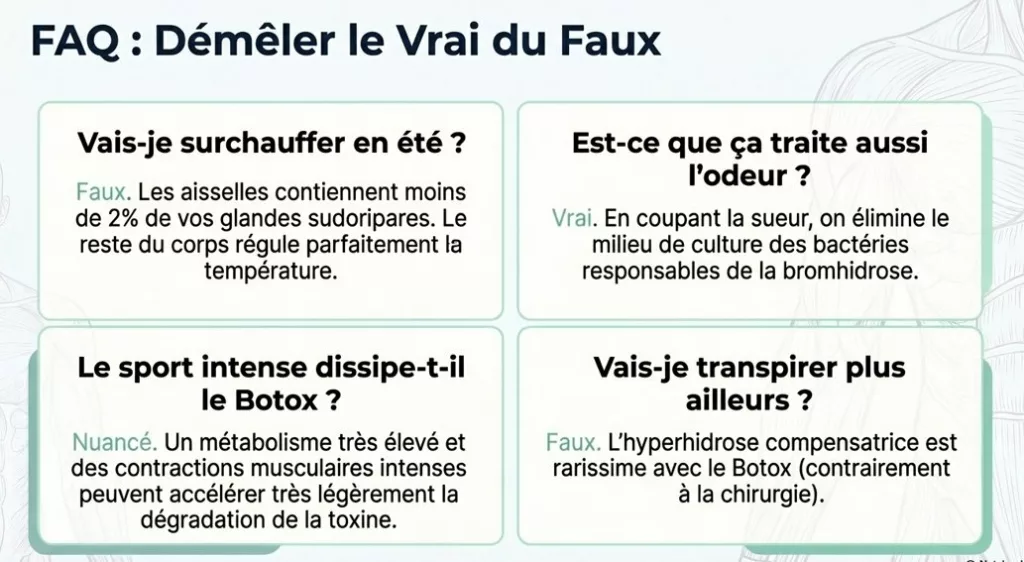 Or, les aisselles ne contiennent qu’environ 2 % des glandes sudoripares du corps, leur destruction n’a donc aucun impact sur la thermorégulation globale.