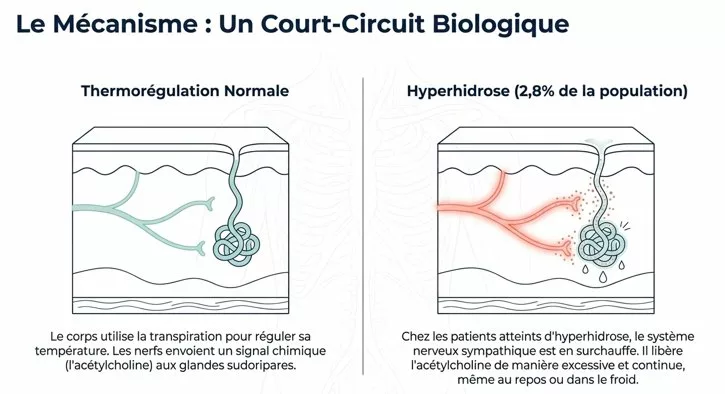 Les aisselles sont particulièrement riches en glandes sudoripares. Chez certaines personnes, ces glandes sont hyperstimulées par le système nerveux sympathique.